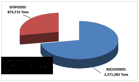 Figure 1-6 graphically represents current generation, recovery and disposal of all Delaware solid wastes.7 As illustrated by Figure 1-6, roughly 3.15 million tons (rounded) of solid wastes were estimated to be generated in 2008, with 2.05 million tons (rounded) estimated to be diverted for recovery and 1.1 million tons (rounded) disposed at DSWA landfills and the Delaware Recycled Products Incorporated landfill.