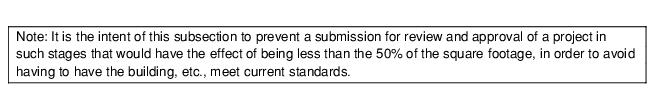 1.1.2 Any proposal that is presented to the Office of the State Fire Marshal for review and approval for a building rehabilitation as defined in the 101 Life Safety Code, for less than 50% of the gross square footage of a non-sprinklered building, may not have another such project for the same building submitted for review and approval any sooner than three (3) years after the date of the final inspection unless sprinkler projection is provided throughout the entire building.