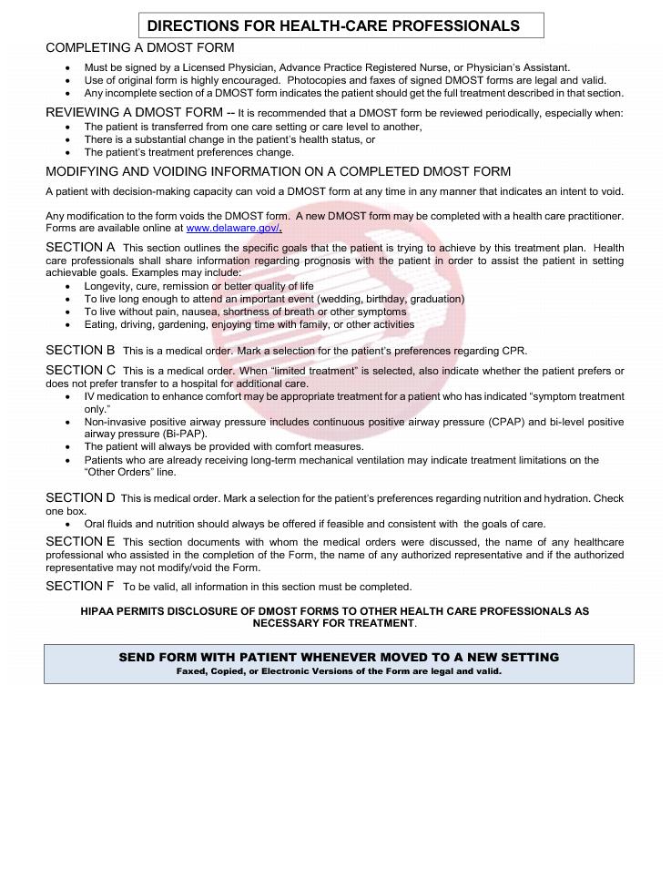 A. The Delaware Medical Orders for Scope of Treatment (DMOST) form is a portable medical order form. It allows you to make choices about life-sustaining treatments, including among other treatments, CPR (resuscitation) and artificial nutrition. You may request full treatment, limited treatment, or comfort care only.