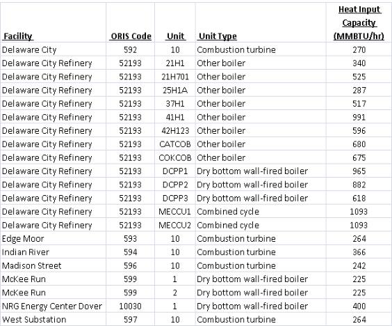 Under the EPA’s CAIR FIP, Delaware’s non-EGUs (co-generation units, large process boilers and heaters, and EGUs with nameplate capacities 15 MW or greater but less than 25 MW) were not included in the CAIR FIP ozone season NOx trading program. The following table lists the 21 units that were subject to Delaware’s 7 DE Admin. Code 1139 and subsequently not subject to the CAIR ozone season NOx trading program under the CAIR FIP: