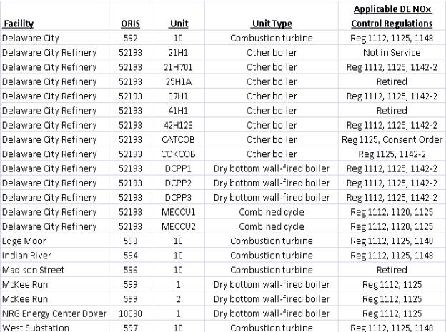 The above referenced Delaware NOx control regulations are applicable to the individual Delaware NOx SIP Call units not transitioning to the CAIR FIP ozone season NOx trading program as shown in the following table: