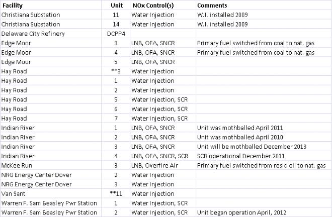 Delaware’s regulations concerning NOx emissions from EGUs, and related consent decrees, have effectively required Delaware’s fleet of EGUs to be well controlled from a NOx emissions standpoint. Delaware’s requirements have resulted in the addition of effective NOx controls and/or modifications to existing EGUs to reduce NOx emission rates. Delaware’s regulations also require any new EGU in Delaware to be well controlled, requiring start-of-the-art controls to meet NOx emissions limitations. A summary of the NOx emissions controls installed on Delaware’s EGUs is shown in the following table: