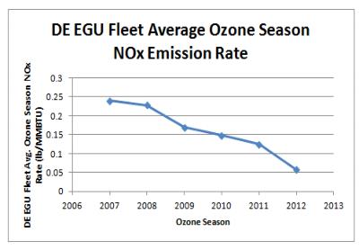The following graph shows the reduction in Delaware’s EGU fleet average NOx emissions rate from the 2007 ozone season through the 2012 ozone season, in terms of lb/MWhr:
