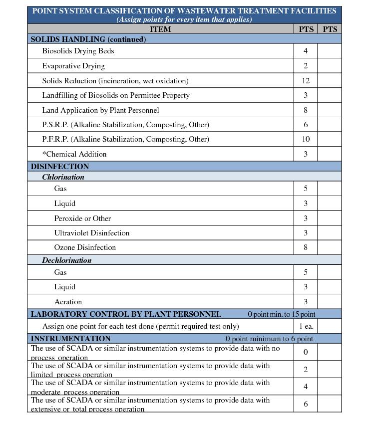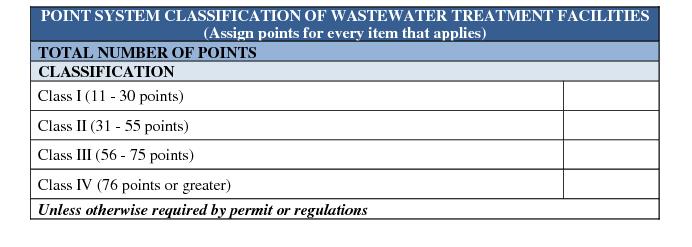 5.2 Classification of Wastewater Treatment Facilities: Wastewater Facilities shall be classified in one (1) of four (4) classes. These classifications shall be made in accordance with the Point System established in accordance with the “State Board of Certification Point System Classification of Wastewater Treatment Facilities” (included as Table 1 of these regulations), and the range of points for each class of facility as shown below: