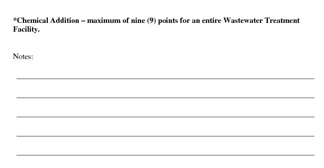 Chemical Addition/Pretreatment: The addition of a chemical to wastewater, at an application point for the purposes of adjusting pH or alkalinity, improving solids removal, dechlorinating, removing odors, providing nutrients, or otherwise enhancing treatment, excluding chlorination for disinfection of effluent and the addition of enzymes or any process included in the Tertiary Chemical/Physical Processes. The capability to add a chemical at different application points for the same purpose, should be rated as one (1) application; the capability to add a chemical(s) to dual units, should be rated as one (1) application; and the capability to add a chemical at different application points for different purposes, should be rated as separate applications.