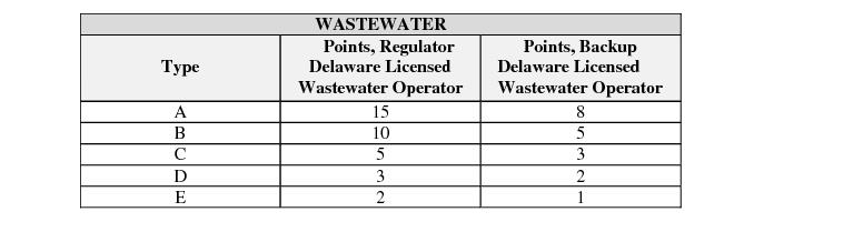 1. A Delaware Licensed Wastewater Operator may serve as a regular and/or backup Wastewater Operator in Direct Responsible Charge (DRC) of a combination of Wastewater Treatment Facilities in accordance with the following table. A Delaware Licensed Wastewater Operator may be approved to operate in DRC any combination of Wastewater Treatment Facilities provided that the total accumulation of regular points from the table below does not exceed 25 regular points. A Delaware Licensed Wastewater Operator may serve as a backup Delaware Licensed Wastewater Operator at Wastewater Treatment Facilities other than the ones currently operated provided the total accumulation of backup points from the table below does not exceed 20 backup points. Special circumstances will be considered by the Board.