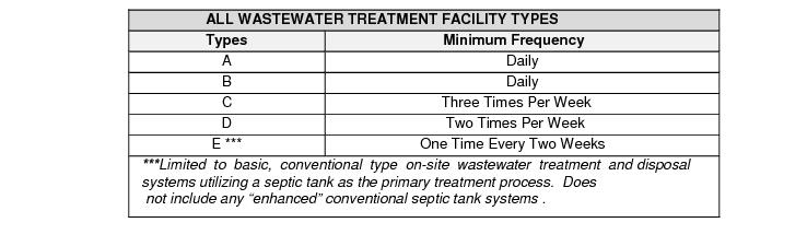 3. The Delaware Licensed Wastewater Operator shall submit a schedule for operating and maintaining all Wastewater Treatment Facilities. A minimum of two (2) Wastewater Treatment Facility operation and maintenance visits per calendar week is required for the simplest of Wastewater Treatment Facilities, [except as noted in the table below]. More frequent visits may be required depending upon the operational complexity of each Wastewater Treatment Facility. In submitting the schedule, the Delaware Licensed Wastewater Operator shall note thereon that the Department shall be notified in writing with an amended schedule within five (5) calendar days of any change to the original or previously approved schedule. Failure to do so may result in revocation of the Delaware Licensed Wastewater Operator’s privilege to operate more than one (1) Wastewater Treatment Facility.