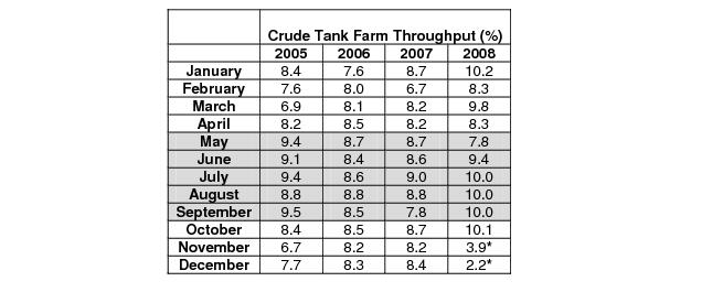 In addition to the comparison between the actual and projected emissions and the facility-wide cap discussed above, seasonal variations were evaluated. The Department analyzed monthly crude oil throughputs from the crude oil tank farm, which is an indicator of the capacity factor of the refinery. Historical throughput is useful data to analyze because such data supports a conclusion that utilization will not drastically vary by month in the future. Four (4) years, 2005 through 2008, were evaluated (see table below).