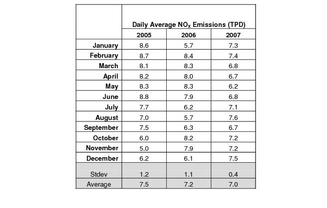 The daily average NOx emissions for each month between January 2005 and December 2007 is within one (1) standard deviation of the annual average daily NOx emissions for each month for all three (3) years, except for June 2005 (which is 1.03 standard deviations from the average). This indicates there is little variation in daily NOx emissions from month to month, and that operations under a 12-month rolling total facility-wide NOx cap will not result in high daily NOx emissions during times of bad air quality, and would not negatively impact applicable requirements.