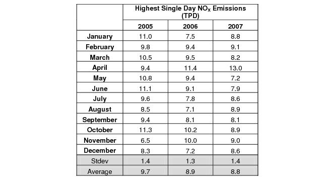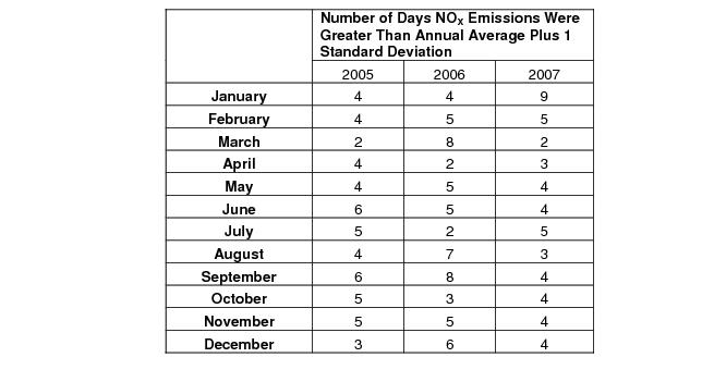 Out of these three (3) years, the maximum number of days that the daily NOx emissions exceed the mean/average plus one (1) standard deviation was only 9 (January 2007). On only seven (7) out of these thirty-six (36) months did the daily NOx emissions exceed one (1) standard deviation more than 5 times. And, the number of times the daily NOx emissions exceeded one (1) standard deviation is constant from month to month.
