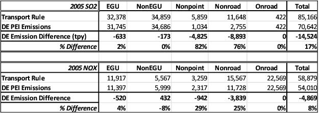 Delaware compared its 2005 Periodic Emissions Inventory (PEI) with EPA’s 2005 NEI (and 2002) emissions used in their assessment of significant contributions for the TR. Delaware then projected its 2005 PEI emissions to 2012, and compared them to EPA’s 2012 Base Case emissions. Delaware’s sulfur dioxide (SO2) and nitrogen oxides (NOx) emissions are significantly overstated in the TR contribution assessment. 2005 and 2012 emissions can be found in the attachments to this document (attachment 1 contains the emission summary tables).