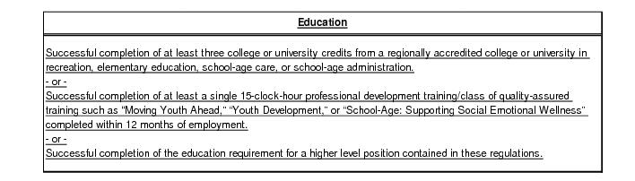 77.1.1 A licensee shall ensure that a school-age administrator is at least 21 years of age and is fully qualified as an early childhood administrator with at least 15 clock hours of approved training in school-age care or meets the following education and experience qualifications: