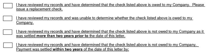 Our records indicate that the check detailed below, issued to <Owner>, has not cleared the bank. In order for us to determine whether this obligation is still due and owing or whether the obligation may have been satisfied, we are requesting that you please review your records and respond back to us as to your findings. After reviewing your records, complete the form below and return it to us within 15 days. If your address has changed, please provide the new address as well as a telephone number.