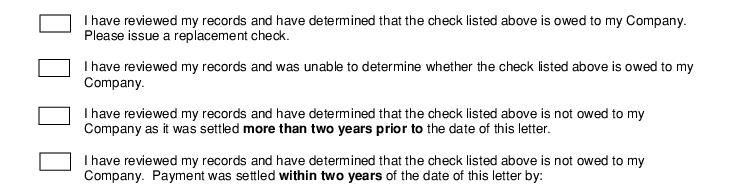 Our records indicate that the check detailed below, issued to <Owner>, has not cleared the bank. In order for us to determine whether this obligation is still due and owing or whether the obligation may have been satisfied, we are requesting that you please review your records and respond back to us as to your findings. After reviewing your records, complete the form below and return it to us within 15 days. If your address has changed, please provide the new address as well as a telephone number.