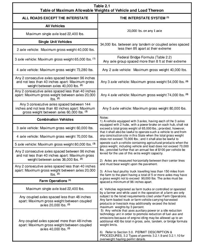 2.4 Weight. A permit is required if the Gross Vehicle Weight (GVW) exceeds the limits imposed by statute as shown in Table 2.1. Vehicles that do not exceed GVW but do exceed individual axle weight(s) show weights shown in Table 2.1 will require a permit. DelDOT Bridge Management Section and Materials and Research Section will automatically review permits with an individual axle weight at or greater than 25,000 pounds lbs. Analysis may occur at a lower weight on a case-by-case basis. The permittee is responsible to effectively distribute a load or reduce the overall weight below this axle limit, as necessary, to lessen the higher live load forces overstressing state structures.
