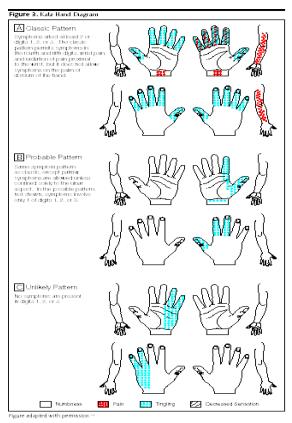 4.2.1.1 Numbness, tingling, and/or burning of the hand involving the distal median nerve distribution; however, distribution of the sensory symptoms may vary considerably between individuals. Although the classic median nerve distribution is to the palmar aspect of the thumb, the index finger, the middle finger and radial half of the ring finger, patients may report symptoms in any or all of the fingers. The Katz Hand diagram (see Fig. 1) may be useful in documenting the distribution of symptoms; the classic pattern of carpal tunnel affects at least two of the first three digits and does not involve dorsal and palmar aspects of the hand. A probable pattern involves the palmar but not dorsal aspect of the hand (excluding digits).