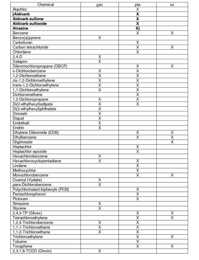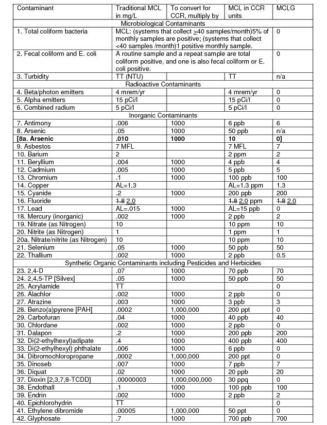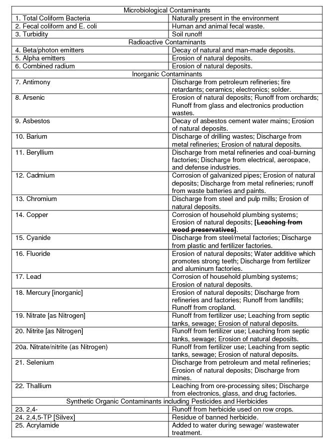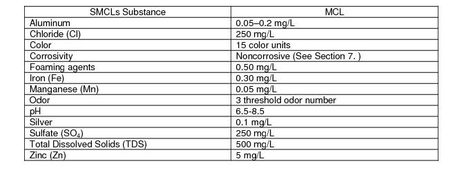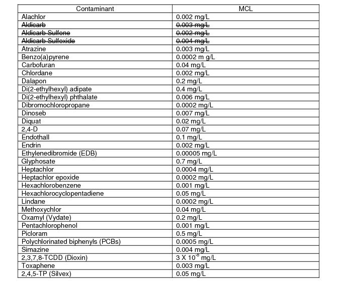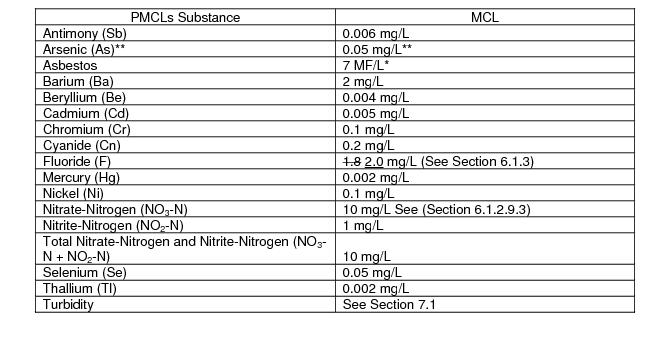 "Primary Maximum Contaminant Level (PMCL)" means an MCL which involves a biological, chemical or physical characteristic of drinking water that may adversely affect the health of the consumer. This includes the MCLs for: coliform bacteria (includes total coliform and E. coli; antimony; arsenic; asbestos; barium; beryllium; cadmium; chromium; cyanide; fluoride; lead; mercury; nickel; nitrates; nitrites; total nitrate/nitrite selenium; thallium; turbidity; alachlor; aldicarb; aldicarb sulfone; aldicarb sulfoxide; atrazine; benzo (a) pyrene; carbofuran; chlordane; dalapon; di(2-ethylhexyl) adipate; di(2-ethylhexyl) phthalate; dibromochloropropane; dinoseb; diquat; 2,4-D; endothall; endrin; ethylenedibromide (EDB); glyphosate; heptachlor; heptachlor epoxide; hexachlorobenzene; hexachlorocyclopentadiene; lindane; methoxychlor; oxamyl (vydate); pentachlorophenol; picloram; polychlorinated biphenyls (PCBs); simazine; 2,3,7,8-TCDD (Dioxin); toxaphene; 2,4,5-TP silvex; total trihalomethanes; benzene; carbon tetrachloride; o-dichlorobenzene; p-dichlorobenzene; 1,2-dichloroethane, 1,1-dichloroetylene; cis-1,2-dichloroethylene; trans-1,2-dichloroethylene; dichloromethane; 1,2-dichlorpropane; ethylbenzene; monochlorobenzene; styrene; tetrachloroethylene; toluene; 1,2,4-trichlorobenzene; 1,1,1-trichloroethane; 1,1,2-trichloroethane; trichloroethylene; vinyl chloride; total xylenes and radioactivity (see Section 9.0).