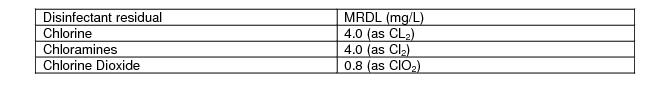 “Maximum Residual Disinfectant Level (MRDL)” means a level of a disinfectant added for water treatment that may not be exceeded at the consumer's tap without an unacceptable possibility of adverse health effects. For chlorine and chloramines, a PWS is in compliance with the MRDL when the running annual average of monthly averages of samples taken in the distribution system, computed quarterly, is less than or equal to the MRDL. For chlorine dioxide, a PWS is in compliance with the MRDL when daily samples are taken at the entrance to the distribution system and no two consecutive daily samples exceed the MRDL. MRDLs are enforceable in the same manner as maximum contaminant levels under Section 1412 of the Safe Drinking Water Act. There is convincing evidence that addition of a disinfectant is necessary for control of waterborne microbial contaminants. Notwithstanding the MRDLs listed in Section 141.65 (Copies available from the Office of Drinking Water), operators may increase residual disinfectant levels of chlorine or chloramines (but not chlorine dioxide) in the distribution system to a level and for a time necessary to protect public health to address specific microbiological contamination problems caused by circumstances such as distribution line breaks, storm runoff events, source water contamination, or cross-connections.