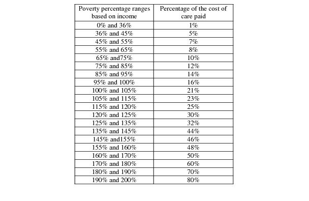 Families with income between: 0% and 36% of poverty, pay 1% of the cost of care