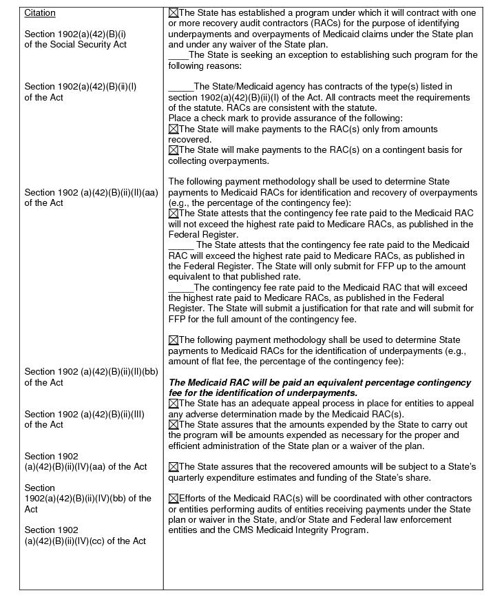 The proposal amends the Title XIX Medicaid State Plan to comply with section 6411 of the Affordable Care Act which amends section 1902(a)(42) of the Social Security Act (the Act) requiring States to establish programs to contract with RACs to audit payments to Medicaid providers by December 31, 2010.