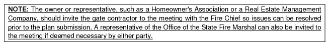 Note: The owner or representative, such as a Homeowner's Association or a Real Estate Management Company, should invite the gate contractor to the meeting with the Fire Chief so issues can be resolved prior to the plan submission. A representative of the Office of the State Fire Marshal can also be invited to the meeting if deemed necessary by either party.