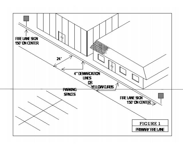 Note: See Figure 5-15 – Marking and Identification of Fire Lane – Parking Between Building and Fire Lane