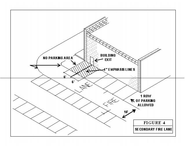 8.4 Demarcation lines on secondary exits shall extend no less than the width of the door to the fire lane.