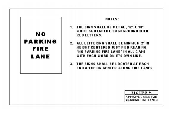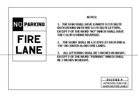 Sign lettering shall be a minimum of 3 inches (3") in height with red scotchlite letters on white scotchlite background. The sign shall be clearly visible from the fire lane or roadway.