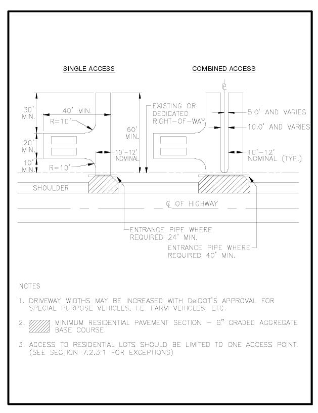 1.3.1.2 The location, design, and construction of driveways and entrances shall meet the geometric requirements of DelDOT. Necessary provisions for drainage, pavement types and thicknesses, sight distance and other construction details shall conform to the current requirements of DelDOT.