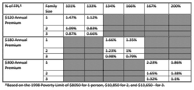 1. The ten dollar ($10.00) per family per month premium for families with incomes between 101% and 133% of the Federal Poverty Level (FPL) is obsolete. Children in these families transitioned to Medicaid effective January 1, 2014.