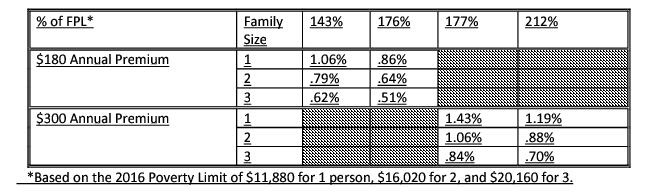 2. The conversion to MAGI-based standards results in a premium of fifteen dollars ($15.00) per family per month for families with incomes ranging from 143% to 176% of the FPL, and $25 PFPM for families with incomes ranging from 177% to 212% of the FPL (refer to CHIP MAGI State Plan Page CS21 for information on the effect of non-payment of premiums). This was a change from the original premium of fifteen dollars ($15.00) per family per month for families with incomes between 134% and 166% of the FPL and a premium of twenty-five dollars ($25.00) per family per month for families with incomes between 167% and 212% of the FPL that was proposed in September 2014.