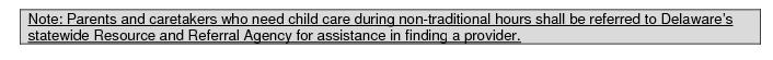 Third, Section 3 includes the following limit: "Relative child care is limited to evening and weekend shift work hours only." This is ill- conceived given the overall shortage of child care providers. Moreover, "special needs" parents and children are eligible for the State child care program. See 16 DE Admin. Code 11003.7.8. It may be extremely difficult for a parent of a special needs child ages 13-18 to identify a licensed provider to add a 13-18 year old to their daycare. Moreover, "special needs" parents often rely on relatives for parenting assistance and federal law requires states to accommodate that reliance. See Joint DOJ/HHS LOF to Mass. Dept. Of Children & Families (1/29/15), published at https://www.ada.gov/ma_docf_lof.pdf. See also U.S. DOJ/HHS Joint Guidance, "Protecting the Rights of Parents and Prospective Parents with Disabilities: Technical Assistance for State and Local Child Welfare Agencies and Courts under Title II of the Americans with Disabilities Act and Section 504 of the Rehabilitation Act (8/15)", published at https://www.ada.gov/doj_hhs_ta/child_welfare_ta.pdf. At a minimum, Section 3 should be revised to allow relative child care for special needs children and adults apart from evening and weekend shifts. It would also be prudent to authorize exceptions for all parents with the approval of DHSS.