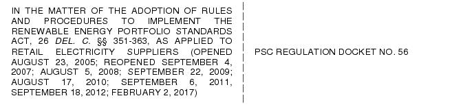 WHEREAS, in compliance with the Court's Memorandum Opinion, on February 2, 2017, the Commission adopted Order No. 9025 in Docket No. 15-1462, which 1) re-opened Docket No. 15-1462 for the limited purpose of complying with the Memorandum Opinion, issued December 30, 2016, in Delaware Division of the Public Advocate v. Delaware Public Service Commission, C.A. N15A-12-002 AML; 2) reversed Ordering Paragraph No. 21 of Order No. 8807, which denied the Petition of the DPA and CRI; and 3) directed Staff to re-open Regulation Docket 56 for the limited purpose of complying with the Memorandum Opinion, issued December 30, 2016, in Delaware Division of the Public Advocate v. Delaware Public Service Commission, C.A. N15A-12-002 AML; that is, specifically to promulgate regulations to amend 26 Del. Admin. C. §3008-3.2.21 and related regulations as needed to specify the procedures for freezing the minimum cumulative solar photovoltaic and eligible energy resource requirements under 26 Del.C. §§354(i) and (j); and