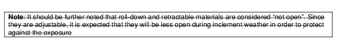 5.20.1.1.2 When used, they shall be located in an area either outside the confines of a building or an area sheltered from the elements by overhead cover that is open on all exterior sides. Any obstruction of the exterior boundary of the area by any material to any degree shall be prohibited. Walls, part walls or partitions, roll-down see-through curtains or drapes, awnings, or components by any other name shall be considered an obstruction.