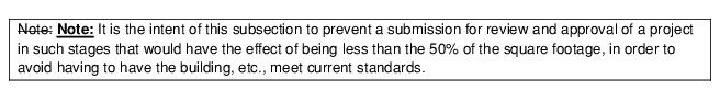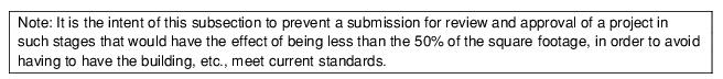 1.1.2 Any proposal that is presented to the Office of the State Fire Marshal for review and approval for a building rehabilitation as defined in the 101 Life Safety Code, for less than 50% of the gross square footage of a non-sprinklered building, may not have another such project for the same building submitted for review and approval any sooner than three (3) years after the date of the final inspection unless sprinkler projection is provided throughout the entire building.