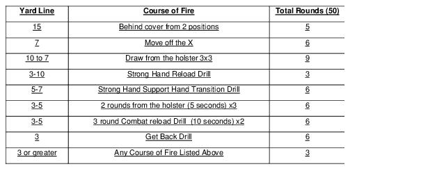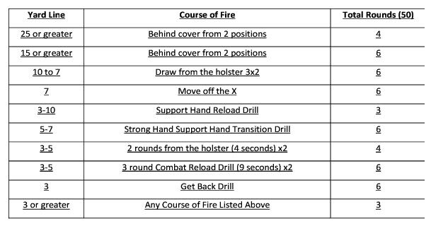 A minimum of 20 rounds will be fired from a distance of 25 yards or greater. Shooters must demonstrate proficiency from at least 50 yards. This may be accomplished by using reduced size targets to simulate 50 yards.