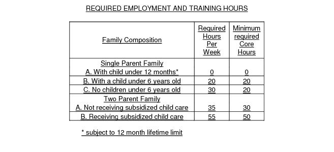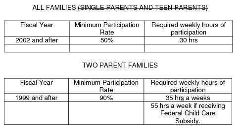 Single parents who are not working 30 hours a week or making an equivalent of 30 hours a week times minimum wage are required to participate in work and/or work related activities. Participation in work and work related activities must equal at least a minimum average of 30 hours a week.; and, at least 20 of the hours per week must come from participation in federally defined core activities.