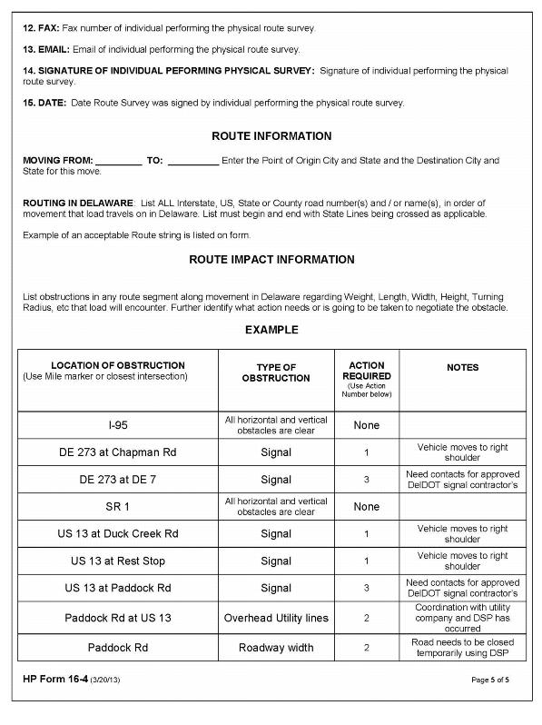 Figure A.2: HP Form 16 State of Delaware SUPERLOAD Route Survey Form
