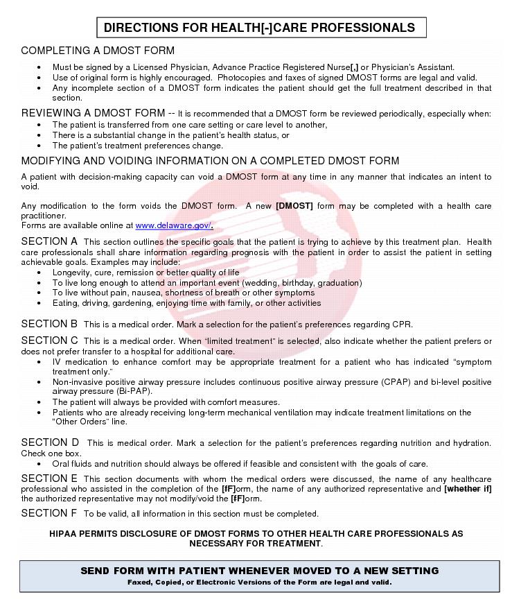 A. The Delaware Medical Orders for Scope of Treatment (DMOST) form is a portable medical order form. It allows you to make choices about life-sustaining treatments, including among other treatments, CPR (resuscitation) and artificial nutrition.You may request full treatment, limited treatment, or comfort care only.