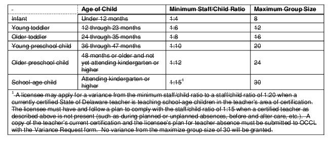 The Office of Child Care Licensing (OCCL) proposes to amend DELACARE: Regulations for Early Care and Education and School-Age Centers in accordance with 31 Del.C §343. This proposal includes the following changes from the current regulations: