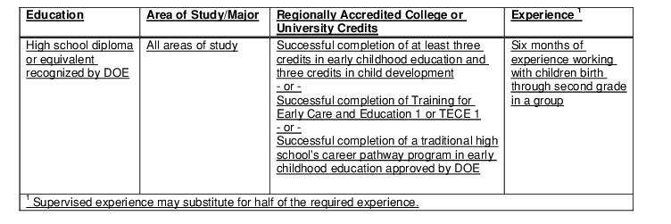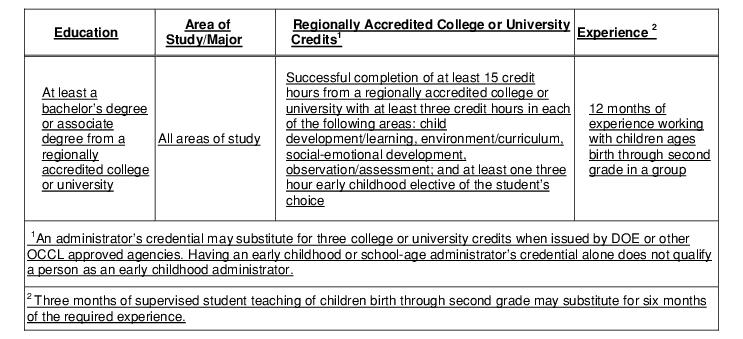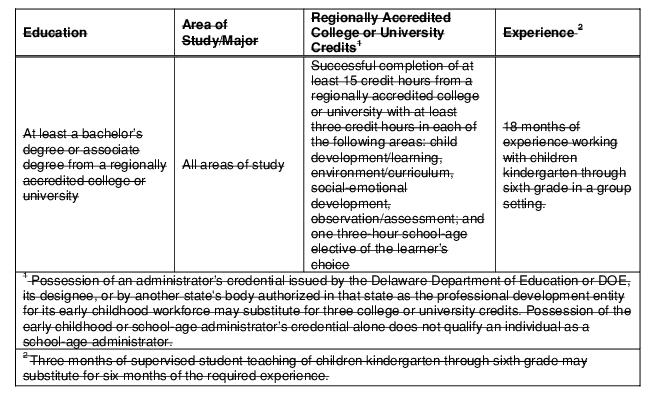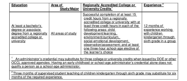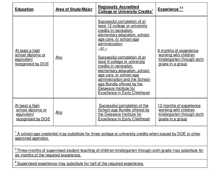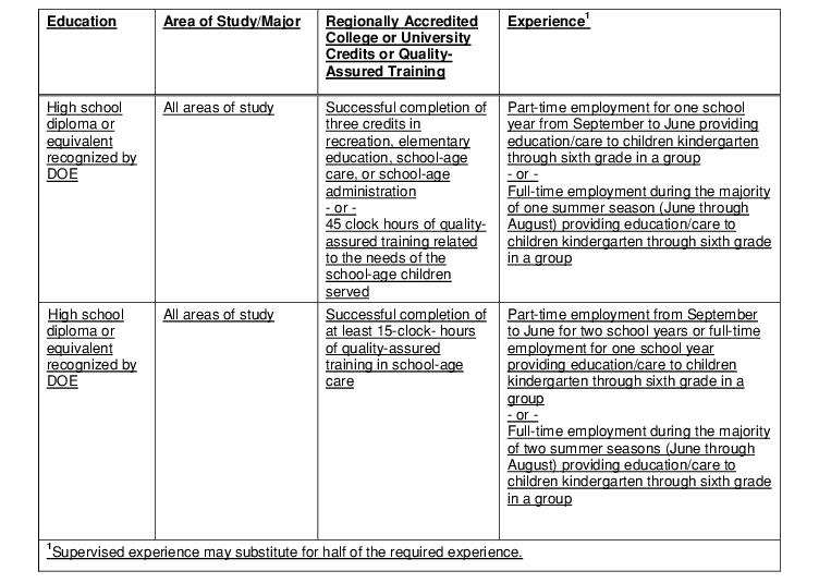 87.4.2.1 Successful completion of at least three college or university credits from a regionally accredited college or university in recreation, elementary education, school-age care, or school-age administration;