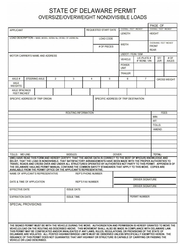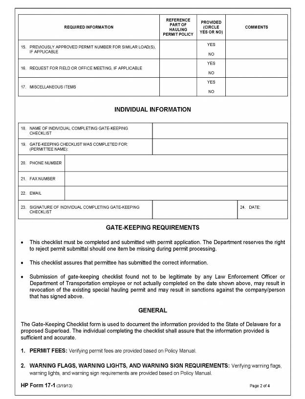 5.3.5.3.2 This type move normally will require State of Delaware SUPERLOAD Gate-Keeping Checklist (HP Form 17). Please refer to Appendix A for forms and samples.