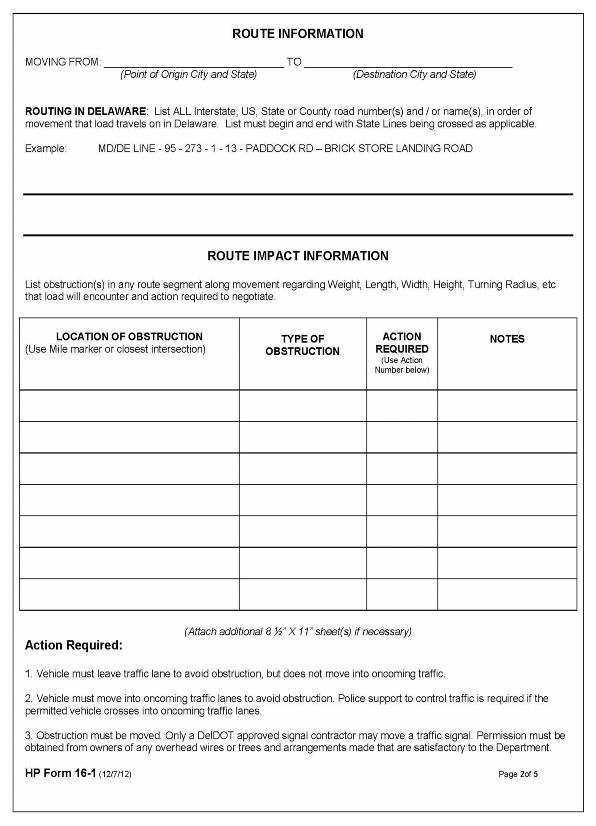 Figure A.2: HP Form 16 State of Delaware SUPERLOAD Route Survey Form