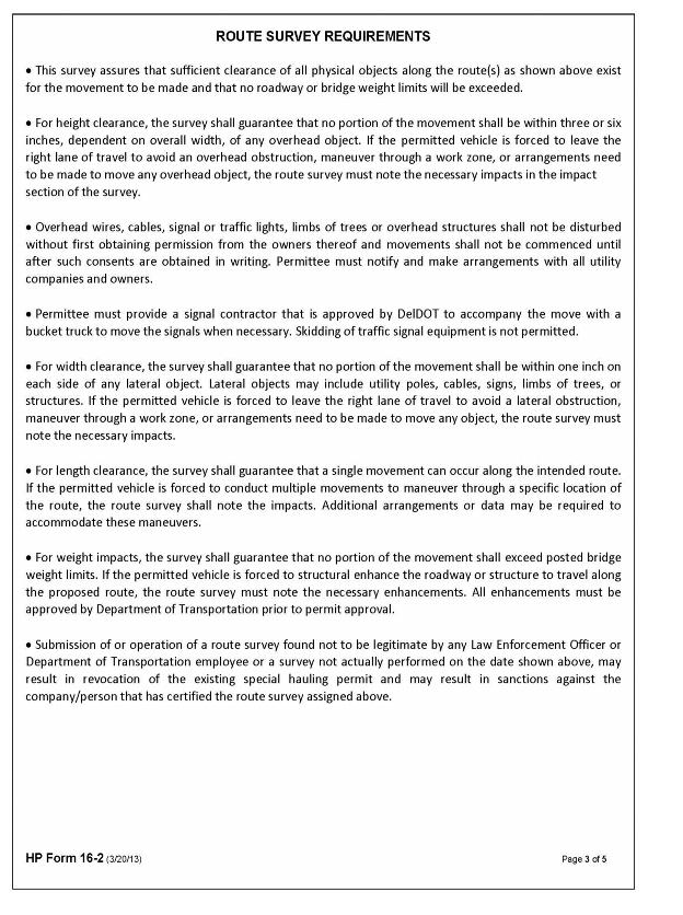 5.3.3.2.2 If a Route Survey (HP Form 16) is required it shall guarantee that no portion of the movement shall be within three or six inches, dependent on overall width, of any overhead object. If the permitted vehicle is forced to leave the right lane of travel to avoid an overhead obstruction, maneuver through a work zone, or arrangements need to be made to move any overhead object, the route survey must note the necessary impacts. Please refer to Section 5.4 entitled Route Survey Requirements. Hauler is responsible for all costs associated with this work. DelDOT Traffic must receive a copy of the route survey prior to the approval of the permit.