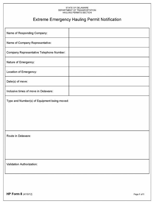 6.3.1.1 Hauler will contact the DelDOT Hauling Permit Office (302) 744-2700 to alert DelDOT Permit Agent of the emergency. Additionally, Hauler will transmit a completed HP Form 8 (Extreme Emergency Hauling Permit Notification) to the HP Office via email to haulpermit@state.de.us or fax to (302) 739-7808.