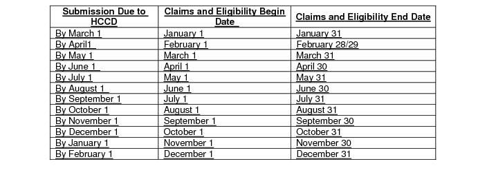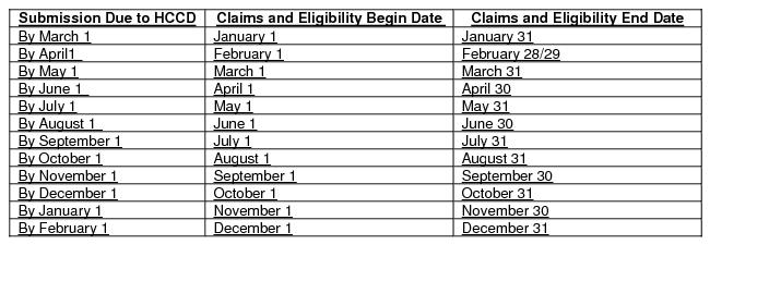 3.5 New Reporting Entities that have not previously submitted files to the HCCD shall notify the HCCD Administrator and shall submit files according to the form and intervals described in Attachment A "Reporting Schedule."