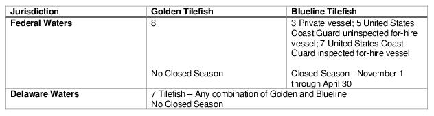The Mid-Atlantic Marine Fisheries Council (MAFMC) approved Tilefish management actions that resulted in a significant increase to the 2020 and 2021 recreational possession limits for Golden and Blueline Tilefish in federal waters, imposed a recreational closed season for Blueline Tilefish and increased the daily landings limit for the commercial Tilefish fishery. Delaware's Tilefish regulation, in effect since 2016, has lower recreational possession limits than the new federal waters limits, no closed recreational season for Blueline Tilefish and a lower daily commercial landings limit. While states may maintain more conservative regulations for state waters than those approved by MAFMC for federal waters, Delaware's current recreational possession limits differing from the federal water possession limits (see the table below) has proven confusing to the angling public, which may lead to inadvertent violations by anglers harvesting Tilefish. For example, a recreational angler harvesting the federal waters possession limit of Golden Tilefish would be in violation of Delaware's regulation. Conversely, a private boat recreational angler harvesting the Delaware possession limit of Tilefish, but only keeping Blueline Tilefish would be in violation of the federal waters Blueline Tilefish possession limit. In addition, Delaware's regulation allows Blueline Tilefish harvest during the federal waters closed season. Finally, Delaware's commercial Tilefish fishery will benefit by increasing the daily landings limit for state waters from 300 pounds to the federal waters limit of 500 pounds. Delaware's Advisory Council on Tidal Finfisheries voted unanimously recommending that Delaware's Tilefish management measures be revised to match the federal waters recreational management measures.