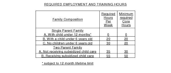 Single parents who are not working 30 hours a week or making an equivalent of 30 hours a week times minimum wage are required to participate in work and/or work related activities. Participation in work and work related activities must equal at least a minimum average of 30 hours a week.; and, at least 20 of the hours per week must come from participation in federally defined core activities.