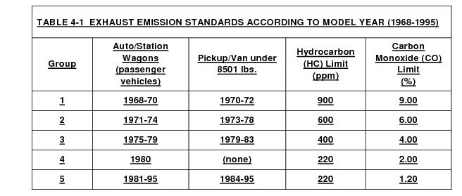 4.2.1 Exhaust emissions from 1968 to 1980 model year vehicles subject to this regulation shall be equal to or less than the rates specified in Table 4-1; determined pursuant to the following idle test requirements: