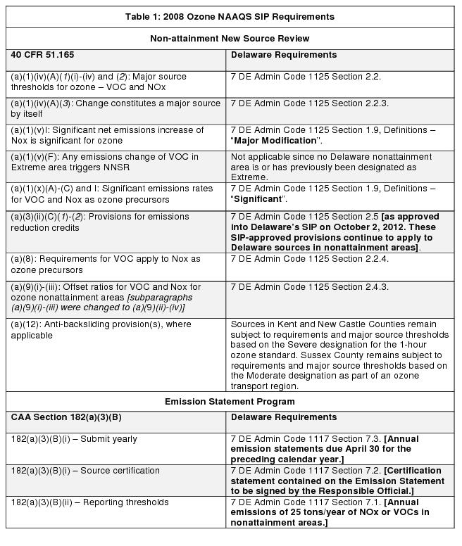 EPA previously approved a state-wide NNSR SIP revision on February 28, 2013 (78 FR 13496) which covered the Philadelphia-Wilmington-Atlantic City, PA-NJ-MD-DE and the Seaford, DE nonattainment areas for the 2008 ozone NAAQS. [Delaware has not subsequently amended the SIP-approved NNSR program. The NNSR program in Delaware’s approved SIP has not been amended.] Upon review of the [SIP-]approved NNSR program, Delaware finds and certify that no changes are necessary to comply with the 2008 ozone NAAQS NNSR requirements. The State of Delaware is certifying that its existing NNSR program is at least as stringent as the requirements at 40 CFR 51.165 for ozone and its precursors, as amended by the final rule titled Implementation of the 2008 National Ambient Air Quality Standard for Ozone: State Implementation Plan Requirements (80 FR 12264, March 6, 2015). [Note that the emission offset provisions of 7 DE Admin Code 1125 approved by EPA into Delaware's SIP on October 2, 2012 (77 FR 60053) continue to apply to DE sources in nonattainment areas. EPA did not approve into the SIP the provisions in 7 DE Admin Code 1125 that DE adopted on December 11, 2016. Thus the provisions in the approved DE SIP remain applicable requirements, and offsets can only be obtained from the expanded area identified in the December 11, 2016 adoption if the offsets also meet the provisions in the SIP (i.e., they are generated in an area of equal to or higher nonattainment classification, and they are shown to directly impact the nonattainment area where the offsets are being used.)] The requirements necessary to appropriately implement Delaware's NNSR program are included in Table 1.